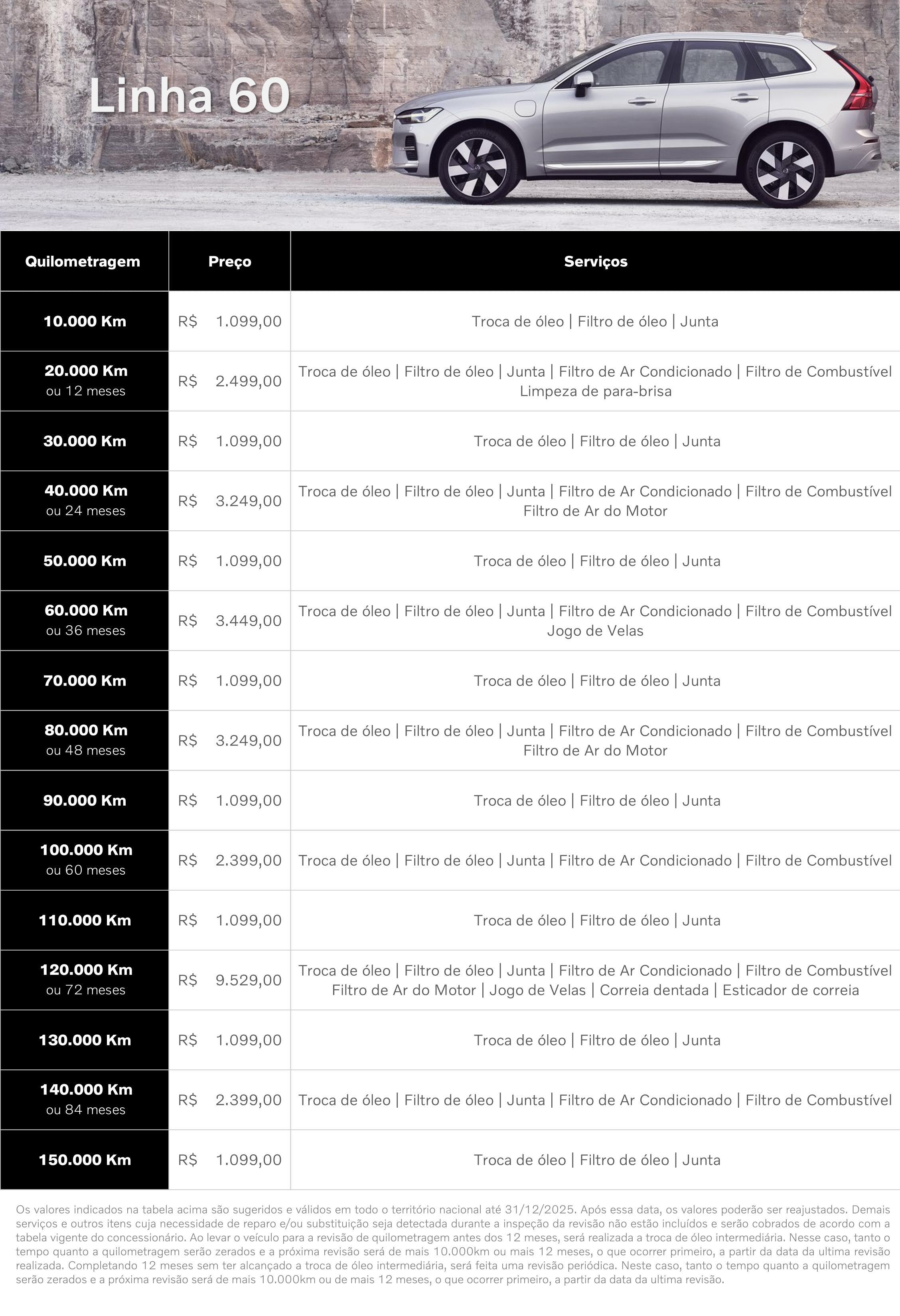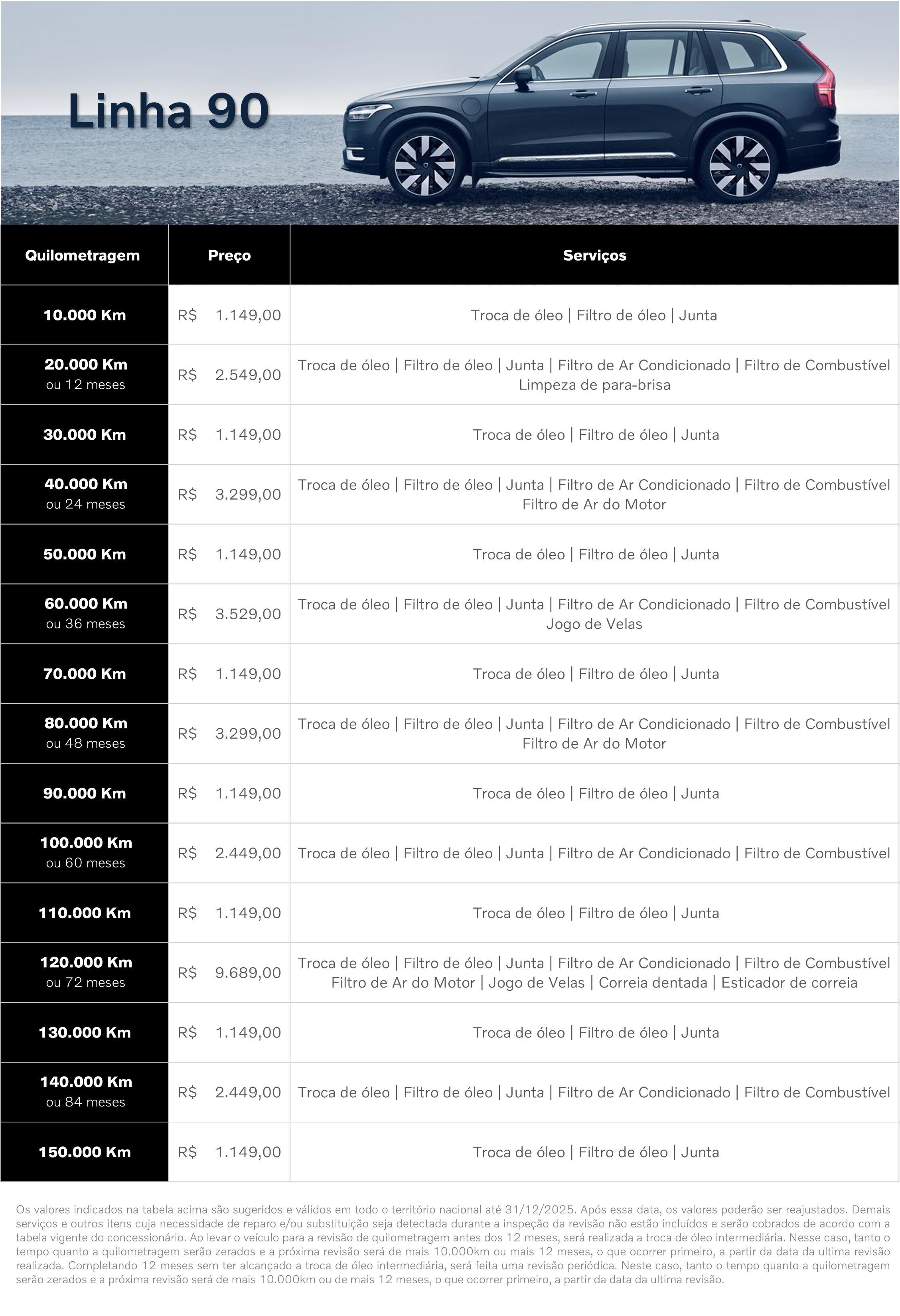 Acesse a página correspondente ao seu Volvo e tenha acesso aos serviços realizados os preços, fixos, de cada uma das revisões até 150mil quilometros.