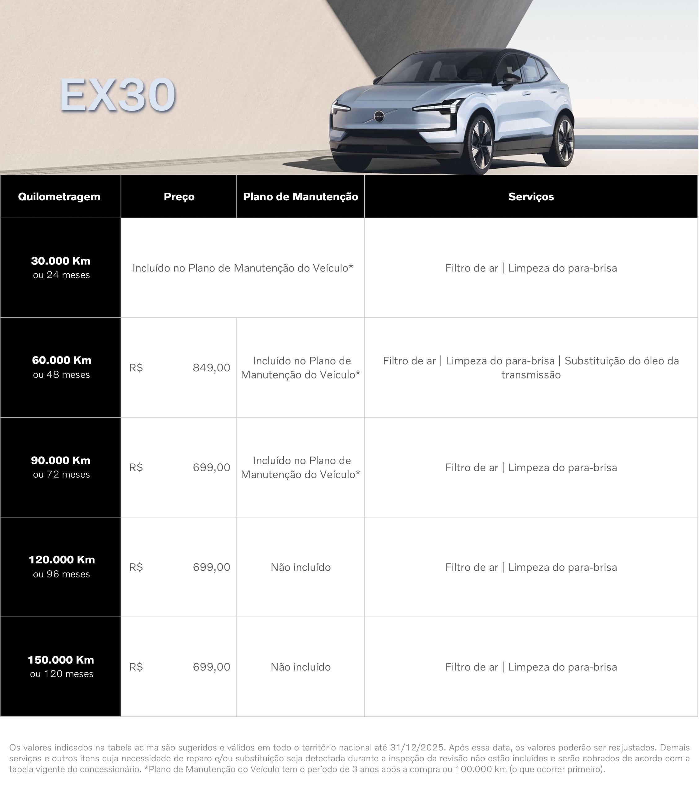 Saiba os valores de cada revisão para seu EX30.